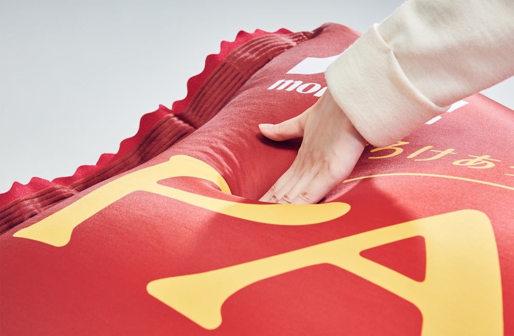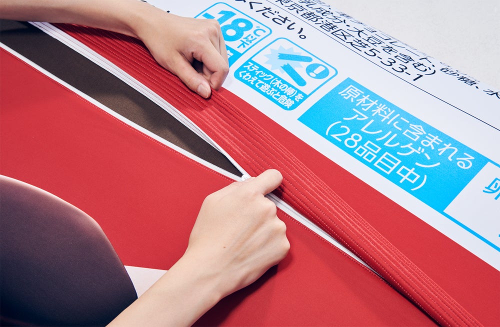 「パルムヨギボー」は「Yogibo(ヨギボー)」のとろけるようなやわらかさはそのままに、デザインには馴染みのある「PARM(パルム)」の赤いパッケージを採用。表のデザインだけでなく、裏側の成分表やバーコードなどの表記、開封時に使用するつまみまで、「PARM(パルム)」の見た目を完全に再現しました。この「パルムヨギボー」に乗って「PARM(パルム)」を食べれば、至福のやわらかさを実感できること間違いなしです。