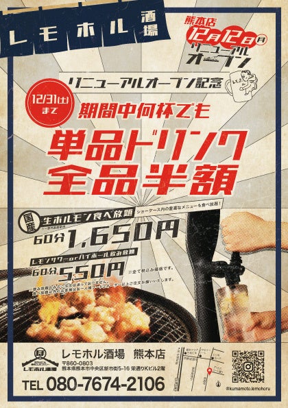 12/12 熊本の一番の繫華街・下通にて【レモホル酒場 熊本店】がメニューも新しくなってリニューアルオープン!さらにお得に、さらに美味しくなったお肉に満足度も格段にアップ!!忘年会などのご予約も絶賛受け付け中!