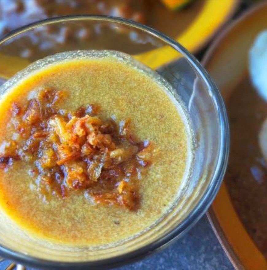 コールドプレスジュースで搾った、たくさんの野菜や果実を使ってできた繊維質豊富なスープです。北海道のメークインをベースにたくさんの野菜や果実を使用した豆乳のポタージュスープです。