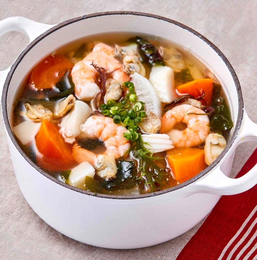 “食べる具沢山スープ”をコンセプトに海の幸を贅沢に使用しました。海老、イカ、あさり、海藻、人参、大根が入ったスープです。