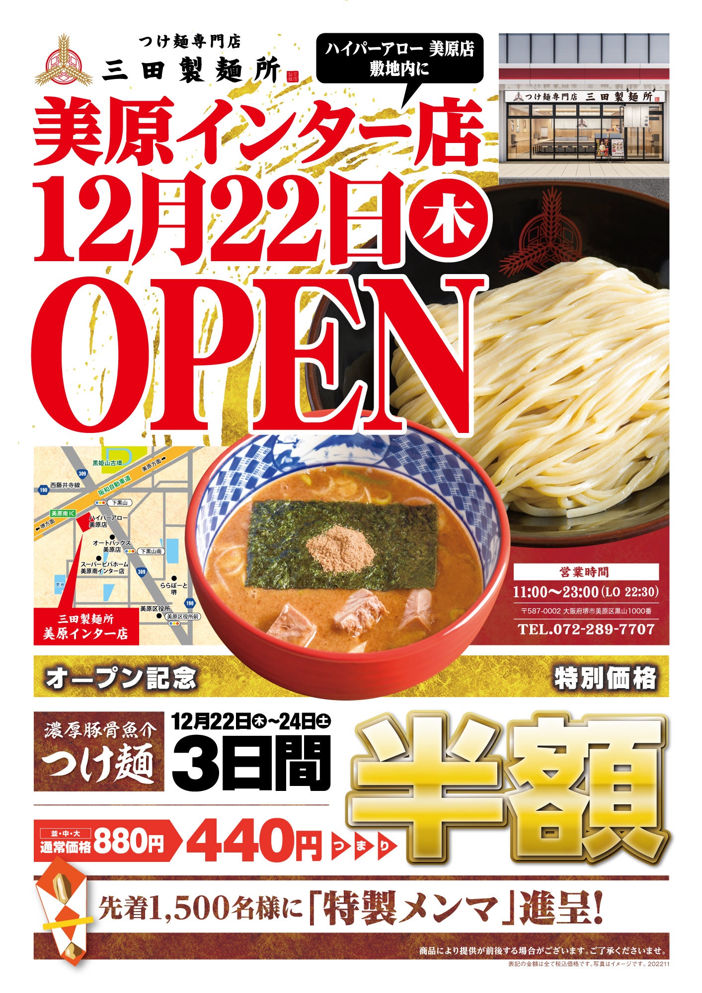 当店のOPENを記念して、12月22日(木)~24日(土)の3日間「つけ麺半額セール」を開催致します。この期間中、三田製麺所の定番『濃厚豚骨魚介つけ麺』が通常880円のところ、半額の440円(ともに税込み)にてお召し上がり頂けます。近隣にお住まい・お勤めの方には、この機会に是非一度お越し頂ければ幸いです。なお、この3日間は通常営業より1時間早い23時閉店(22:30L.O)とさせて頂きます。