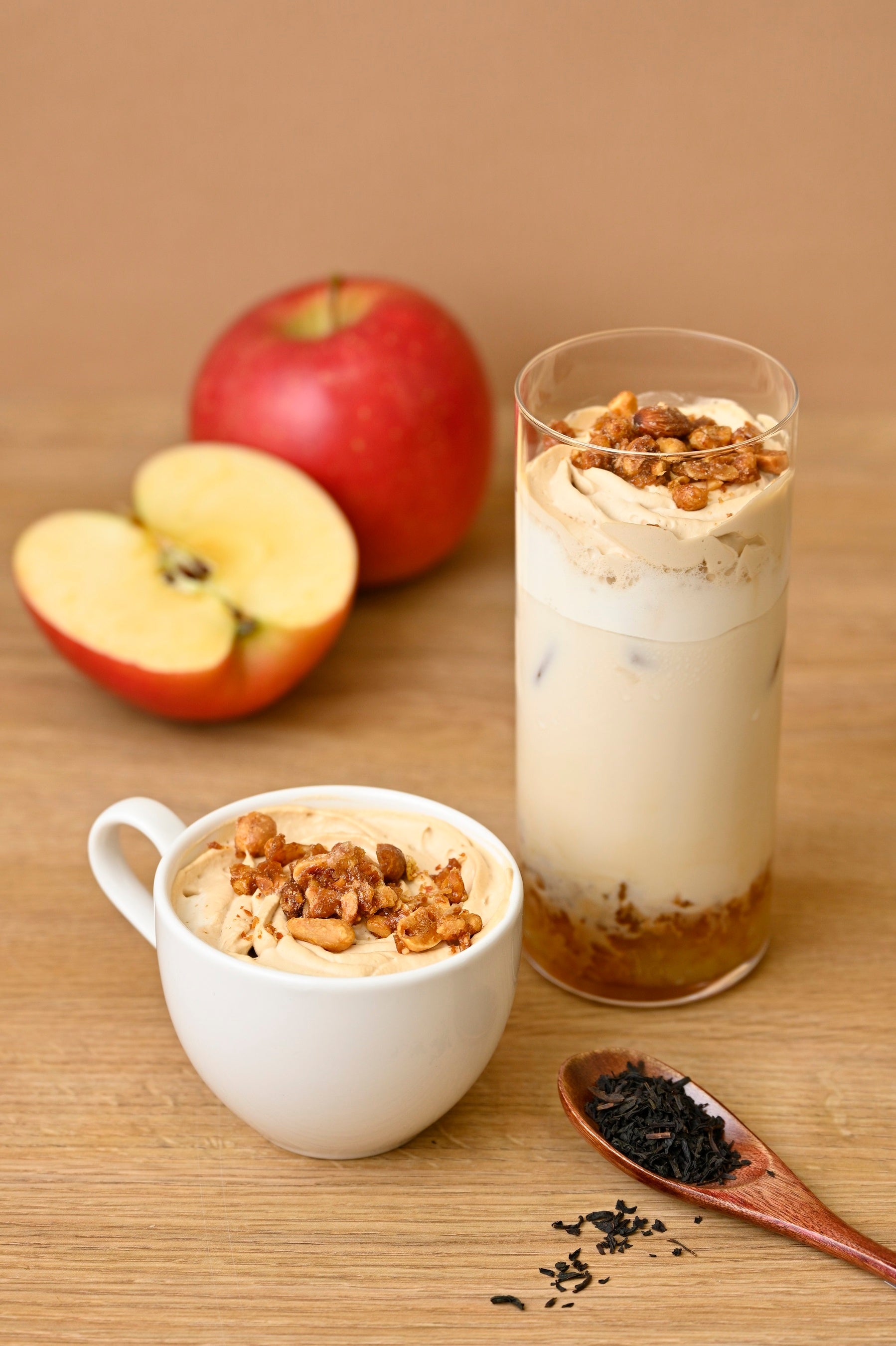 すっきりとした甘さのミルクティーにサクッと食感のりんごを合わせ、紅茶クリームとフロランタンをトッピングしました。テイクアウトも可。