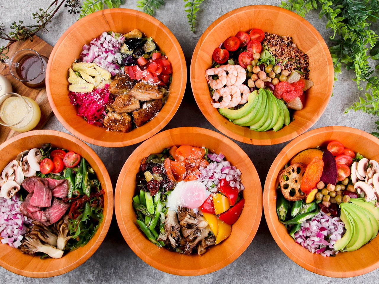 サラダは、ヘルシーな「海老とアボガドのスピナッチサラダ」や、ボリューム満点の「スパイスチキンとローストアップルのサラダ」など5種類を取り揃えました。サラダだけでも満足感のあるボリュームが魅力です。さらにお好みのトッピングを追加して、「マイサラダ」が完成します。