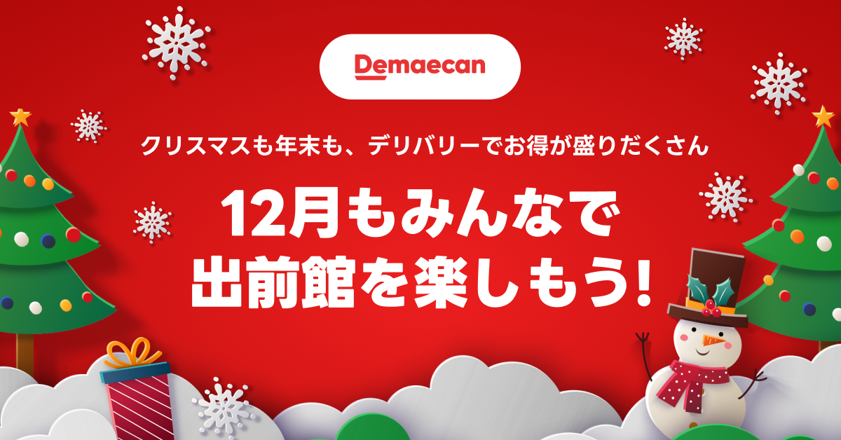 株式会社出前館(本社:東京都渋谷区、代表取締役社長:藤井英雄)が運営する日本最大級のデリバリーサービス『出前館』が、2022年12月度に実施するキャンペーン情報とクリスマス特集をお知らせいたします。