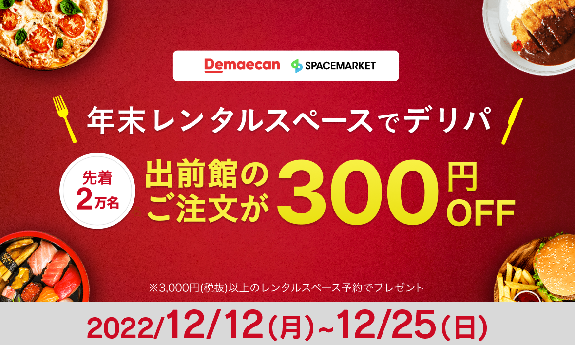 ① 「スペースマーケット」で3000円(税抜)以上のレンタルスペースをご予約完了後に、『出前館』の301円以上(送料除く)の注文で使える300円オフクーポンをメールにて配布