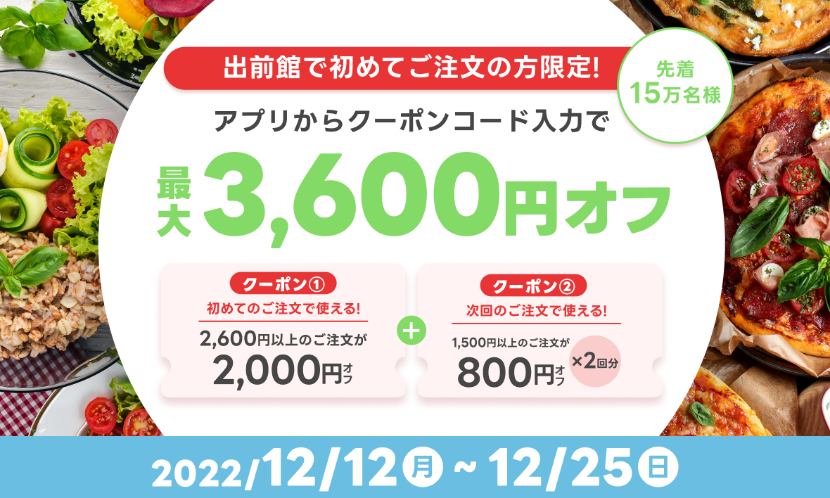 『出前館』は、2022年12月度に、おなじみの“ピザ半額祭”や“送料無料キャンペーン(一部エリア限定)”に加え、スペースを貸し借りできるプラットフォーム「スペースマーケット」でデリバリーパーティーがお得に楽しめる“2022年レンタルスペースで「デリパ」キャンペーン”を開催いたします。また、クリスマスにぴったりなスイーツやディナーの特集、期間中に利用いただけるクーポンの特集もご用意しております。