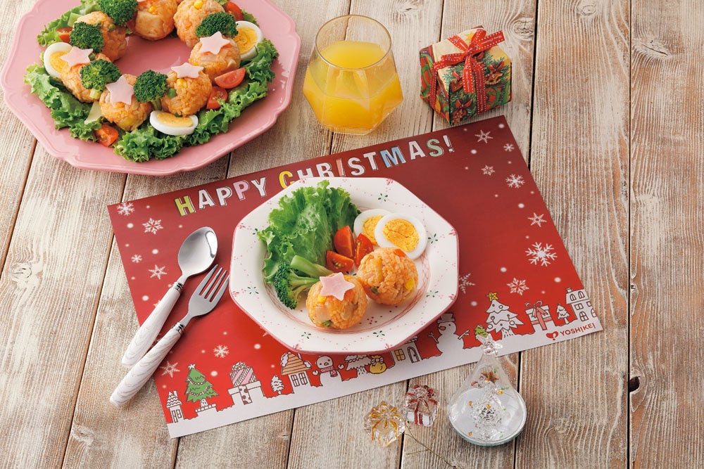 メニューブック中面のヨシケイオリジナルランチョンマットを切り取り、料理を並べることで、よりクリスマス