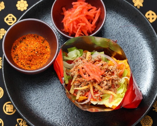 野菜にタケノコ入りの牛そぼろや紅生姜、七味など日本由来の具材を加えた当店オリジナルの和風ドリロコス 。紅生姜の酸味と食感、七味とうがらしの刺激はジャパニーズ・NINJAを想起させます。