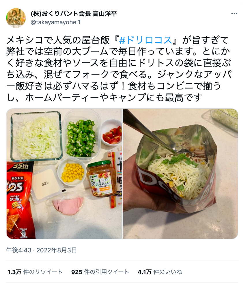 主に、メキシコの路上で屋台販売されるドリロコス。市販のトルティーヤチップス「ドリトス」に、直接肉や野菜などの具材を混ぜ入れて食べるドリロコスは、メキシコの国民食として親しまれています。高山がこのドリロコスを自宅で調理したところ、あまりの美味しさに感動。お裾分けにとレシピをTwitterに投稿すると、瞬く間にツイートは拡散され、ドリロコスは局所的にブームとなりました。