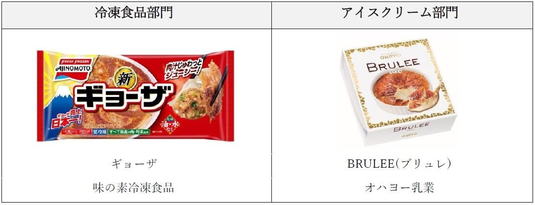 新商品の エントリー 商品 から、メディア1 社様が選定。 デザイン、ヒット期待度、PR動画での表現力、コンセプトを軸に採点しました。本賞は新たなヒット商品の発掘や、フローズン・アワードの目的でもある、新規顧客取り込みのために、新商品にスポットを当てています。