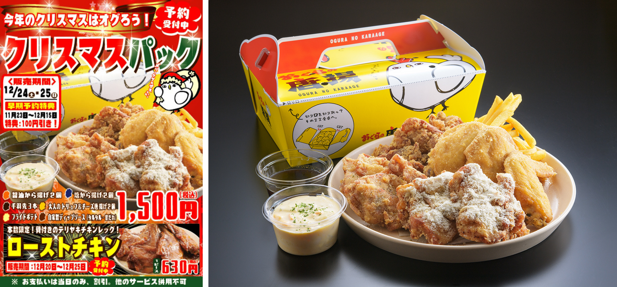 | ▼クリスマスパック 商品概要 商品名 :クリスマスパック 金額 :1,500円(税込) 予約受付 :~12月25日(日) 早期予約特典:12月15日(木)まで 100円引き ※早期予約特典割はおぐらの唐揚での予約受取に限ります お渡し日 :12月24日(土)、25日(日) 販売店舗 :おぐらの唐揚全店舗、さくらや食産阿蘇肉工房 <内容> |