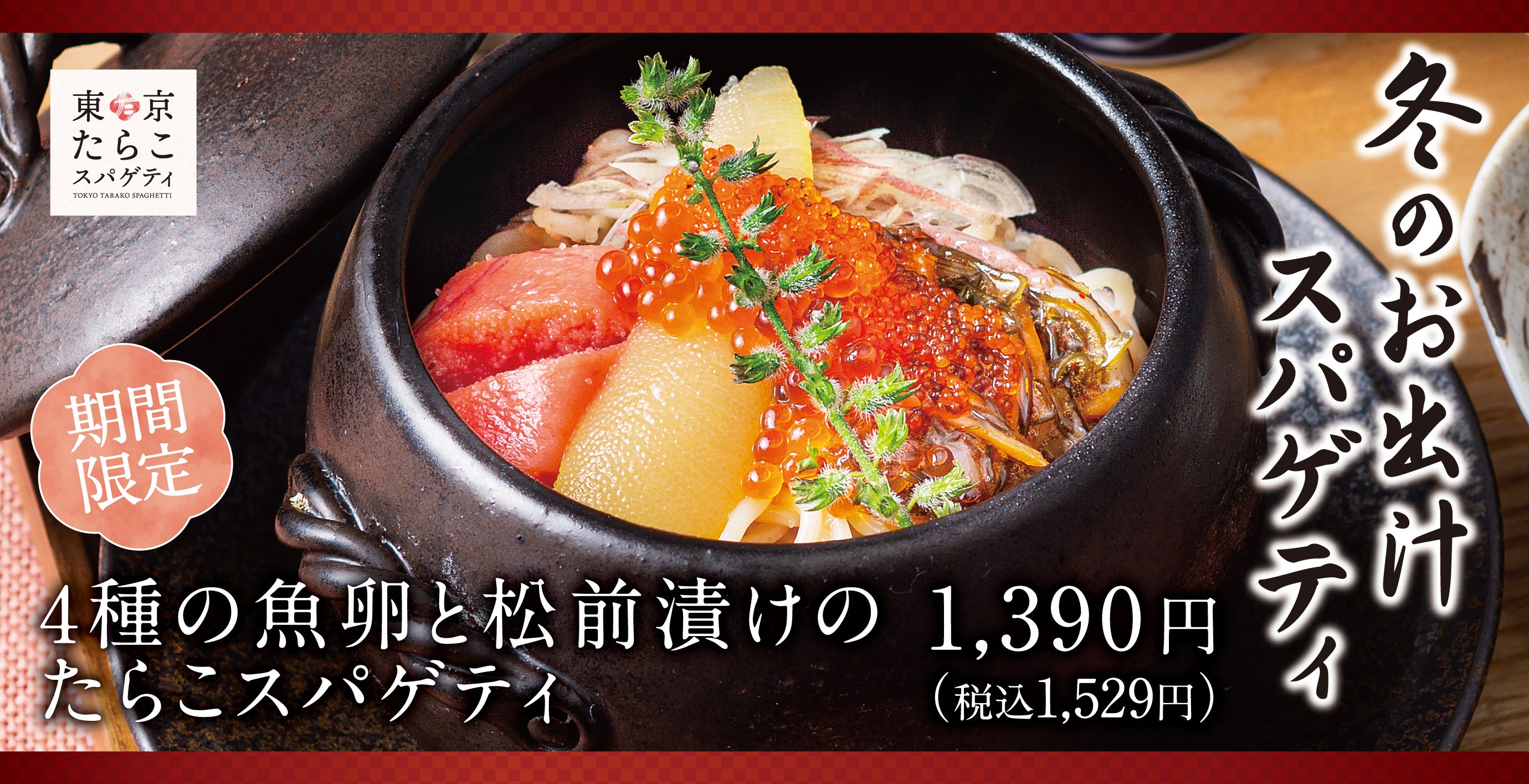 たらこスパゲティ専門店「東京たらこスパゲティ」の名物となっている「お出汁スパゲティ」シリーズに、年末年始ならではの見た目に華やかな「4種の魚卵と松前漬けのたらこスパゲティ」が新登場。