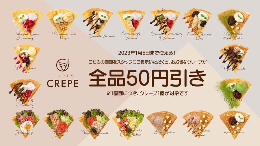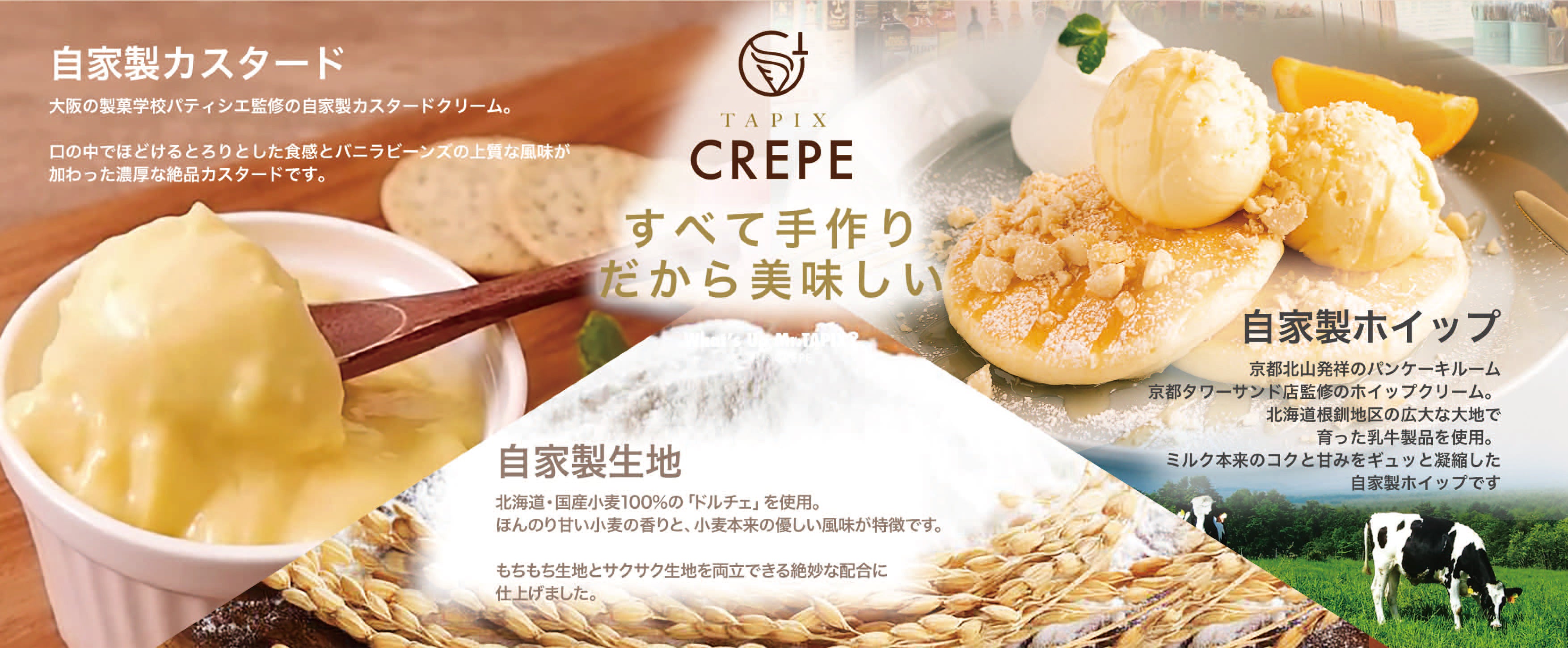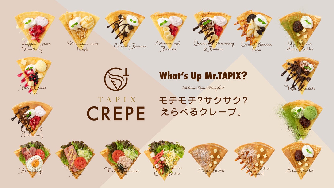 2022年11月14日(月)、京都市北区北野白梅町にTAPIX CREPE (タピックス クレープ)がニューオープン。北海道・国産小麦100%のドルチェを使用した「自家製生地」、パティシエ監修のとろける口当たりとバニラビーンズの風味が特徴の「自家製カスタード」、北海道根釧産生クリームを使用した「自家製ホイップ」などすべてが自家製。素材とレシピに拘りぬいたクレープ店です。生地はもちもちとサクサクの2種類、20種類以上の豊富なフレーバーから自分好みのクレープを探せます。