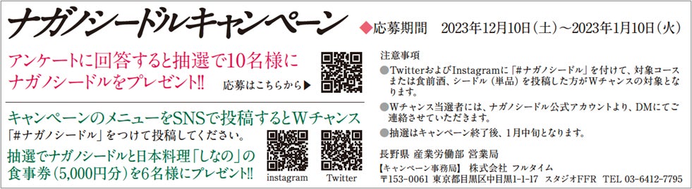 キャンペーン期間中に対象コースを召し上がった方およびシードルをご注文された方で、お食事の写真をSNSに投稿いただいた方の中から抽選で、ナガノシードルとホテルメトロポリタン長野内レストラン「日本料理しなの」のお食事券5,000円分を6名様にプレゼントいたします。