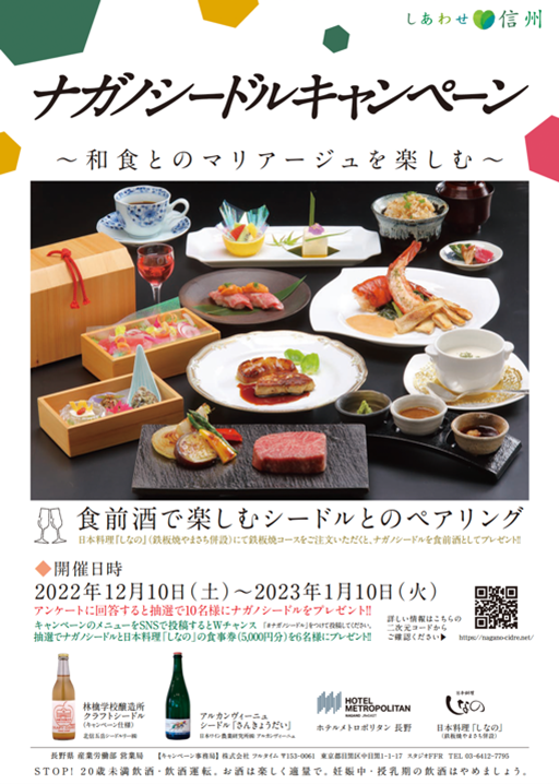 株式会社フルタイム(本社:東京都目黒区、代表取締役社長:渡邉 匠)は、長野県と連携しナガノシードルの認知向上とシードルとの出会いの機会創出を目的としたナガノシードルキャンペーンを開催致します。その第一弾として、2022年12月10日(土)から2023年1月10日(火)までホテルメトロポリタン長野にて、「和食とのマリアージュを楽しむ」を開催中です。