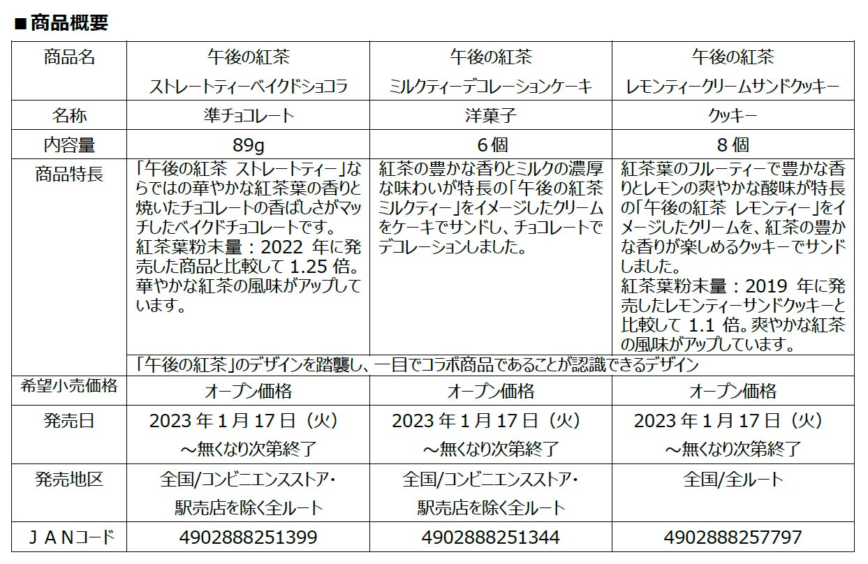 森永製菓株式会社(東京都港区芝、代表取締役社長・太田 栄二郎)とキリンビバレッジ株式会社(東京都中野区、代表取締役社長・吉村 透留)は、「午後の紅茶 ストレートティーベイクドショコラ」、「午後の紅茶 ミルクティーデコレーションケーキ」、「午後の紅茶 レモンティークリームサンドクッキー」を共同開発し、森永製菓より2023年1月17日(火)から期間限定で新発売いたします。「午後の紅茶 ストレートティー/ミルクティー/レモンティー」の特長を生かし、菓子のおいしさを追求しました。