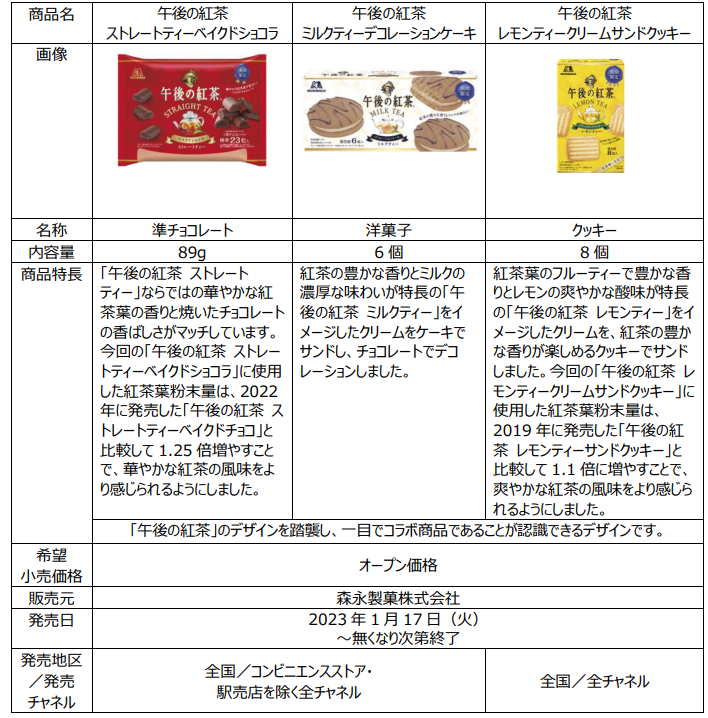 キリンビバレッジ株式会社(社長 吉村透留、以下 キリンビバレッジ)と森永製菓株式会社(社長 太田栄二郎、以下 森永製菓)は、「午後の紅茶 ストレートティーベイクドショコラ」、「午後の紅茶 ミルクティーデコレーションケーキ」、「午後の紅茶 レモンティークリームサンドクッキー」を共同開発し、森永製菓より2023年1月17日(火)から全国で期間限定で新発売します。