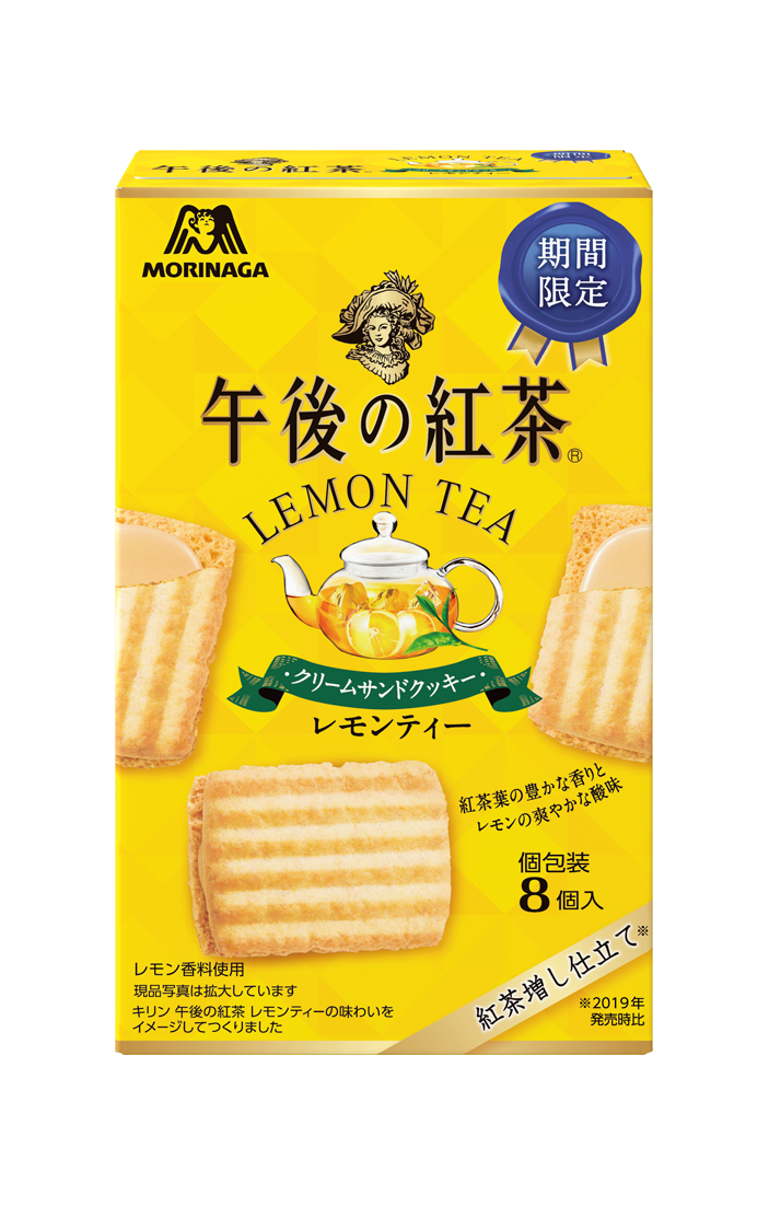 紅茶葉のフルーティーで豊かな香りとレモンの爽やかな酸味が特長の「午後の紅茶 レモンティー」をイメージしたクリームを、紅茶の豊かな香りが楽しめるクッキーでサンドしました。今回の「午後の紅茶 レモンティークリームサンドクッキー」に使用した紅茶葉粉末量は、2019年に発売した「午後の紅茶 レモンティーサンドクッキー」と比較して1.1倍に増やすことで、爽やかな紅茶の風味をより感じられるようにしました。