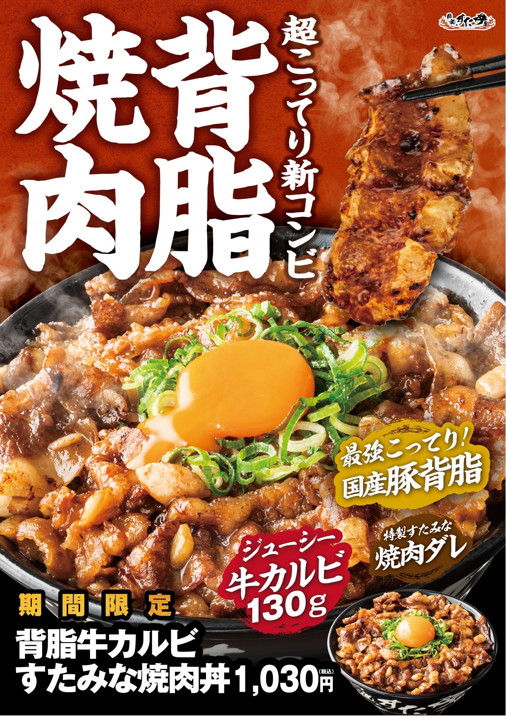 ついに今年も残すところあと1ヶ月を切り、多くの方が一年の締めくくりをされ、想いを馳せられているかと思います。気象庁が先月発表した12月からの3カ月間気候予報によりますと、冬型の気圧配置が強まり寒気が流れ込みやすくなることで全国的に例年より寒くなると予想されています。寒い時に人体は多くのカロリーを消費して体温を調節するため、自然と高カロリーで脂質の高い食べ物を欲するようになります。『大盛り丼界のパイオニア』を自負する当店としては、多くのお客様にボリュームとすたみなあふれる豪快肉丼を食べていただき冬の厳しい寒さを乗り切ってほしいという想いがございます。そのため、焼肉の王様「牛カルビ」に、コクのある「背脂」と特製焼肉ダレを乳化させ混ぜ合わせるという斬新なアイデアを採用し、すた丼屋でしか味わえない超こってり豪快肉丼の『背脂牛カルビすたみな焼肉丼』を開発いたしました。
