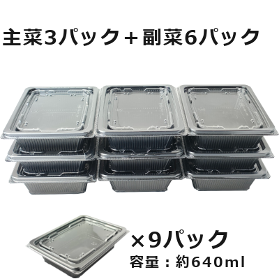 主菜が3パック、副菜が6パックの合計9パック入ったお惣菜です。3~4人前3回分のおかずの分量になります。