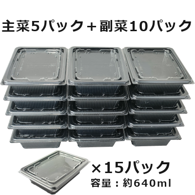 主菜が5パック、副菜が10パックの合計15パック入ったお惣菜です。3~4人前5回分のおかずの分量になります。