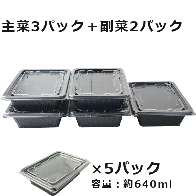 主菜が3パック、副菜が2パックの合計5パック入ったお惣菜です。1人前5回分のおかずの分量になります。