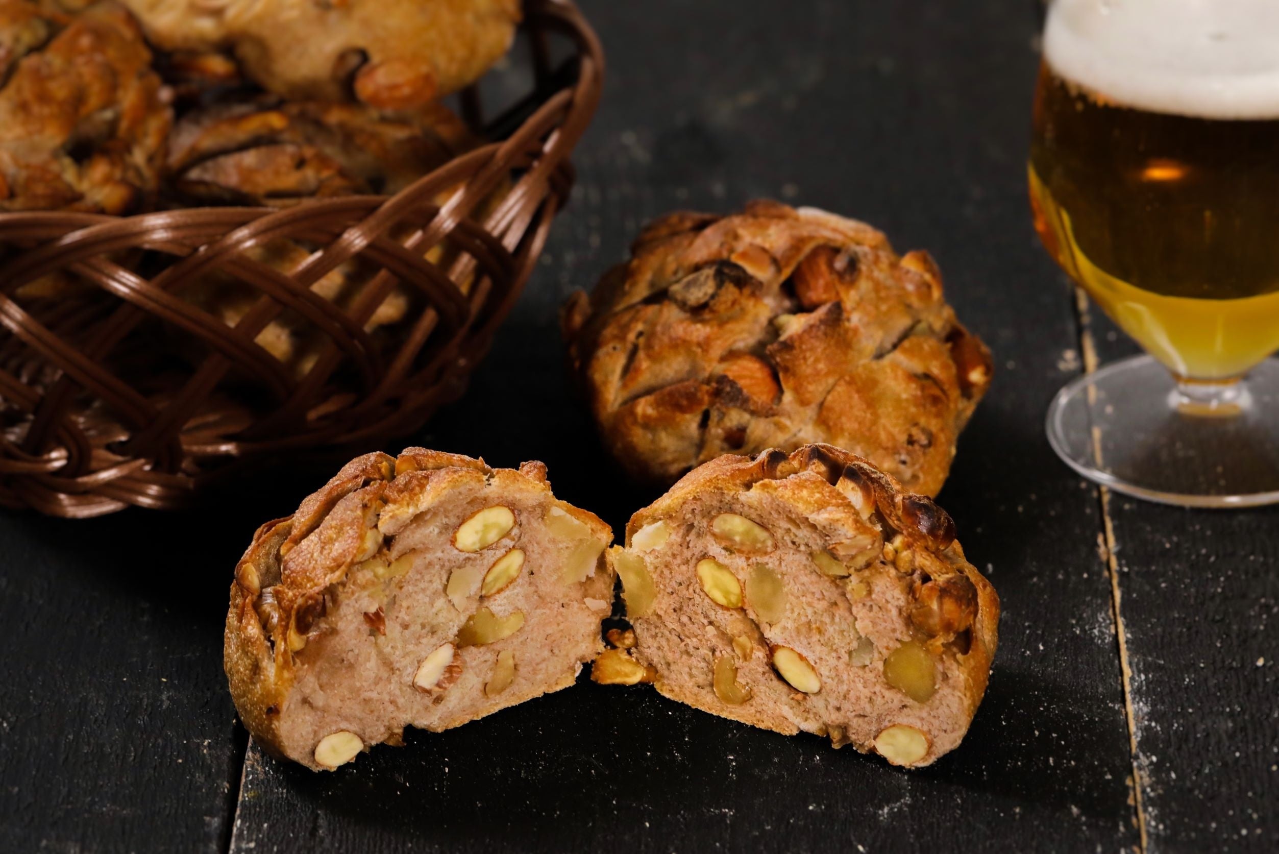 - ビールで捏ねた”ビアブロード生地“に、ローストしたクルミ、マカデミアナッツ、アーモンドの3種のナッツを入れて焼き上げました。
