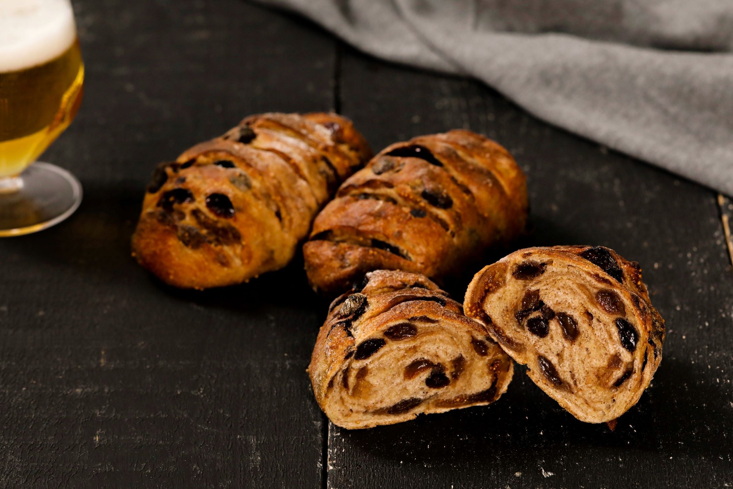 - ビールで捏ねた”ビアブロード生地“に、赤ワイン漬けのイチジクとレーズンを合わせて焼き上げました。