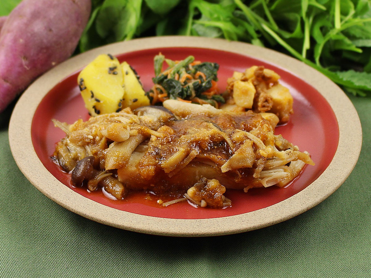 副菜は、黒ごまをまぶした蒸しさつまいも、ほうれん草のごまあえ、里芋のそぼろあえです。