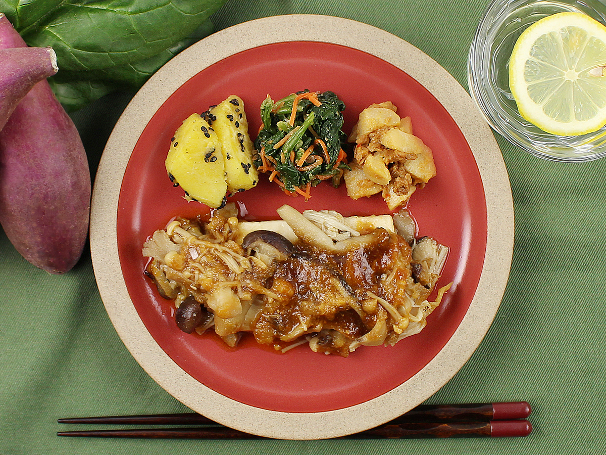 副菜は、黒ごまをまぶした蒸しさつまいも、ほうれん草のごまあえ、里芋のそぼろあえです。