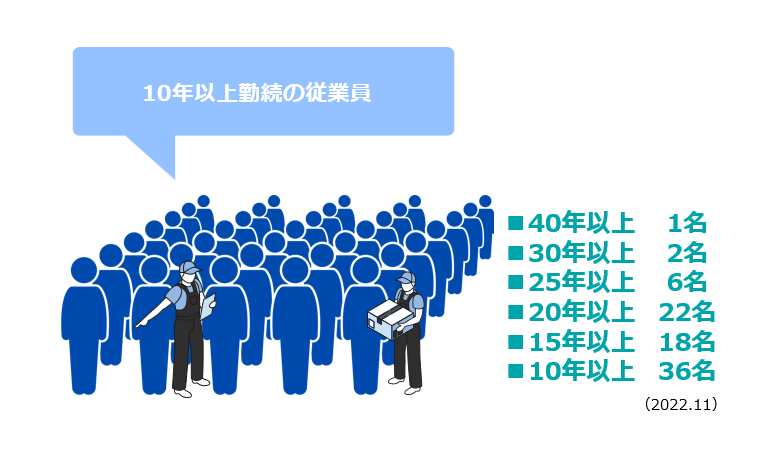 40年勤続を筆頭に10年以上勤続する従業員が、上記の通り80名を超えます。入社当時、ドライバーだった人が所長職へとキャリアステップを描くケースや経営部門で活躍する事例も見られます。来年以降も表彰を控えている従業員は多く、これからも一人ひとりの特性に合わせた活躍の場を提供し、長く・働きやすい会社づくりを目指します。