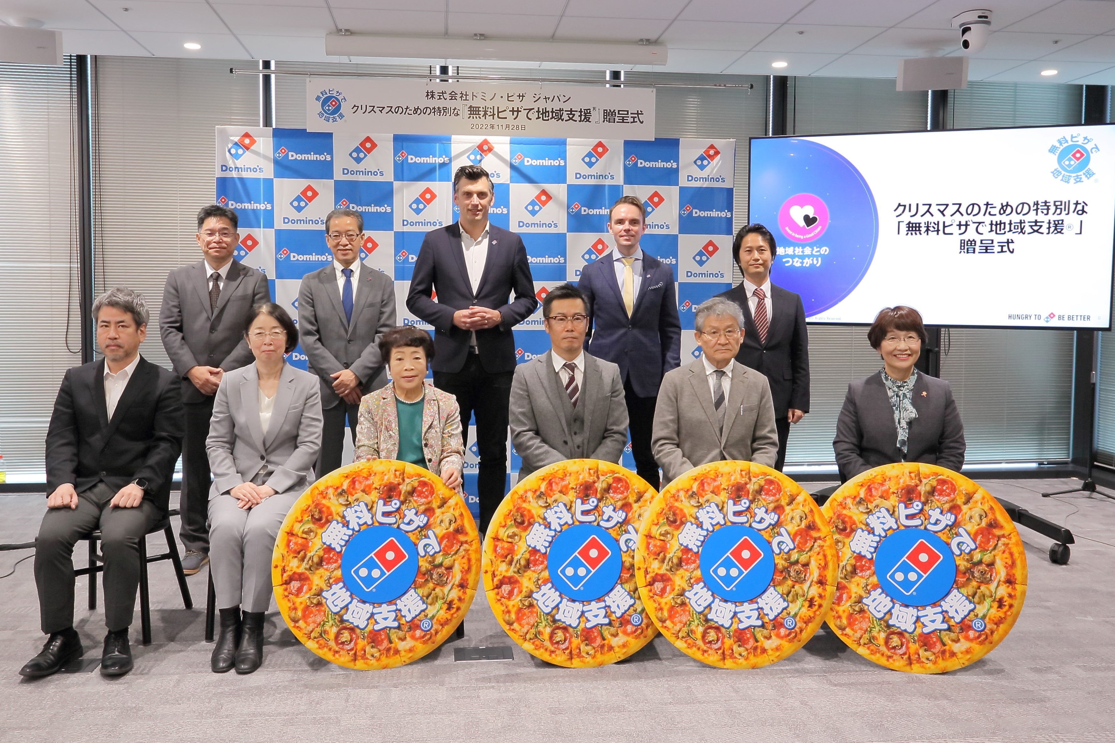 株式会社ドミノ・ピザ ジャパン(代表取締役:ジョシュア・キリムニック、CEO:マーティン・スティーンクス、本社:東京都品川区、以下:ドミノ・ピザ)が展開する国内No.1シェアを誇る宅配ピザチェーン ドミノ・ピザは、クリスマスのスペシャルプレゼントとして、全国の社会的養護を必要とする子どもの支援関連団体※1,563団体、44,372人の子どもを対象に、17,283枚のピザの無料提供を行うことを決定しました。クリスマスシーズンに向けて、2022年12月14日(水)から12月20日(火)までの間、全47都道府県のドミノ・ピザ店舗から提供します。支援先の決定を受け、支援先代表団体の方々を招き、11月28日(月)に贈呈式を実施しました。