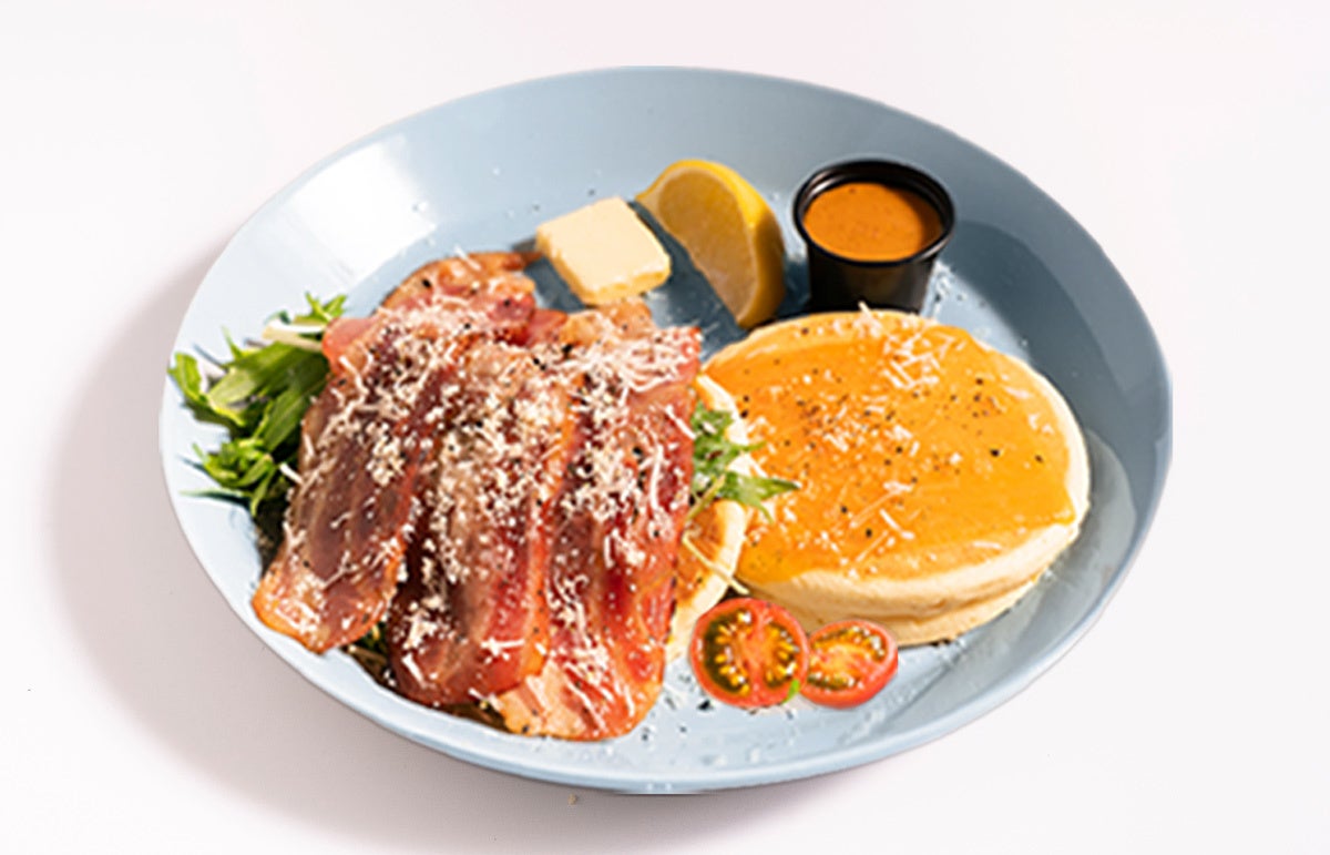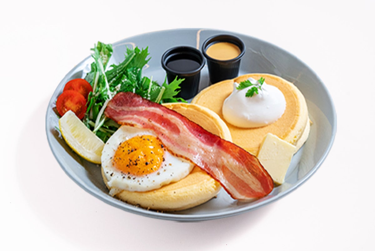 甘すぎないパンケーキに卵とベーコンの相性はバッチリ、甘い物が苦手でもさくっとお召し上がりいただけます。