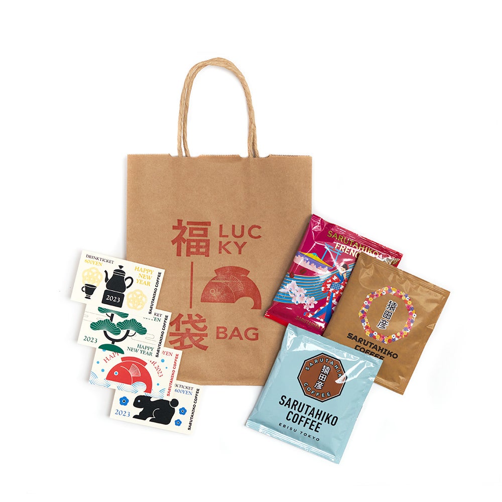 | 猿田彦珈琲の福袋2023 店舗版 内容:ドリップバッグ20枚(大吉DB/4枚、みちひらきDB/4枚、お年玉DB/3枚、 恵比寿シティDB/2枚、猿田彦フレンチCB/3枚、フローラルDB/2枚、 ディカフェDB/1枚)、ドリンクチケット(600円分/4枚) 価格:¥4,000(税込) 販売店舗:猿田彦珈琲店舗全店 ※ドリンクチケットの使用可能店舗は、豆屋別館、品川店、池袋POPUPを除く全店 販売開始:2022年12月1日(木) 店舗受取開始:2022年12月20日(火) オンライン版(ドリップバッグの福袋) |