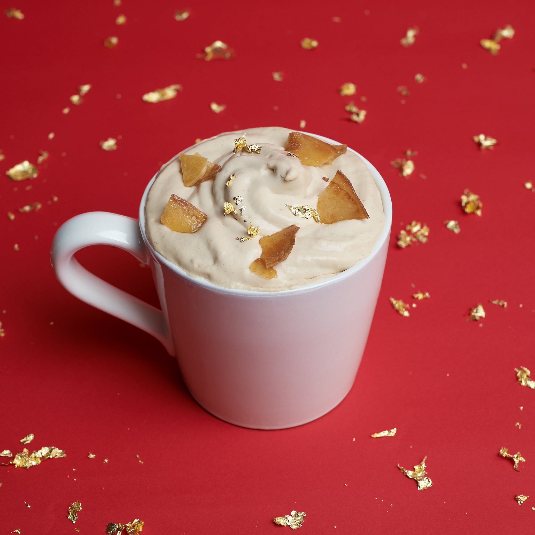 猿田彦珈琲のお正月の定番ドリンク。金時芋は、黄金色に輝く財宝に見立てられ、金運を呼ぶ縁起物として年初めに食べられる“きんとん”に使用される食材です。徳島県産の鳴門金時を濃厚なペーストにし、ミルクと一緒にスチームし、きび糖、みりんなど和の食材を隠し味に、ほんのりとした金時芋の甘みが感じられるラテに仕上げました。コーヒーの風味は、エスプレッソホイップをトッピングすることで、より芋の風味を感じていただける設計にしました。最後にかりかり食感のさつまいもチップスと金箔をふりかけて仕上げました。お正月気分にぴったりの贅沢な味わいで、年始のひと時をお過ごしください。