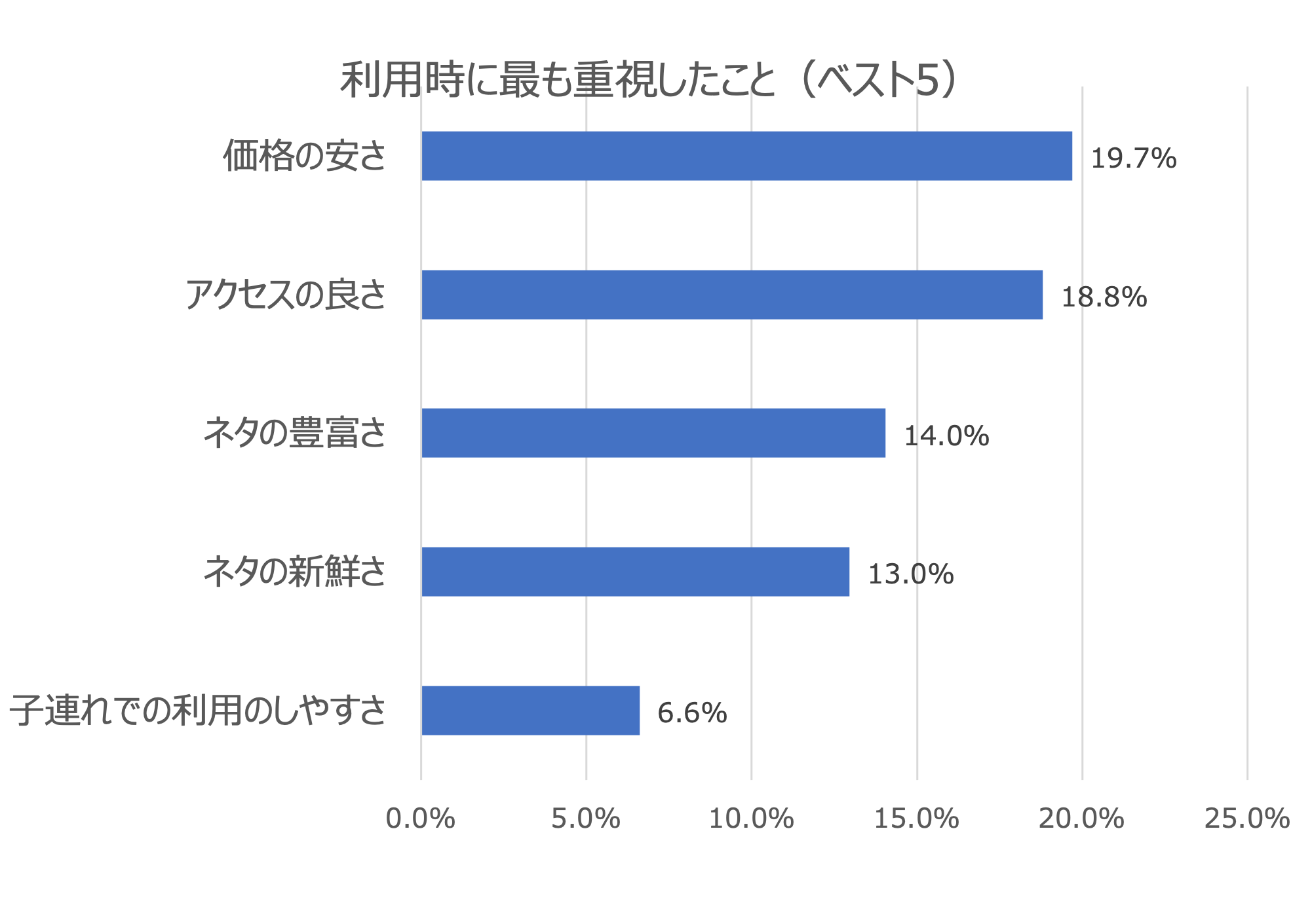 回転ずしチェーンを利用する時に最も重視していることは、「価格の安さ」がトップ、次いで「アクセスの良さ」「ネタの豊富さ」「ネタの新鮮さ」「子連れでの利用のしやすさ」がランクインしました(上記グラフ)。