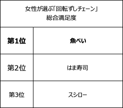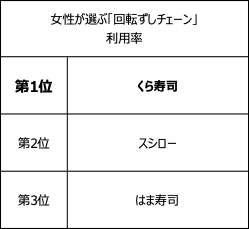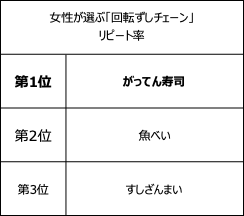 ウーマンリサーチでは、全国のWeb会員を対象に「回転ずしチェーン」についての調査を実施。利用率第1位は「くら寿司」、総合満足度第一位は「魚べい」(同店は価格満足度、おいしさ満足度、おすすめ率も受賞)、リピート率第一位は「がってん寿司」となりました。