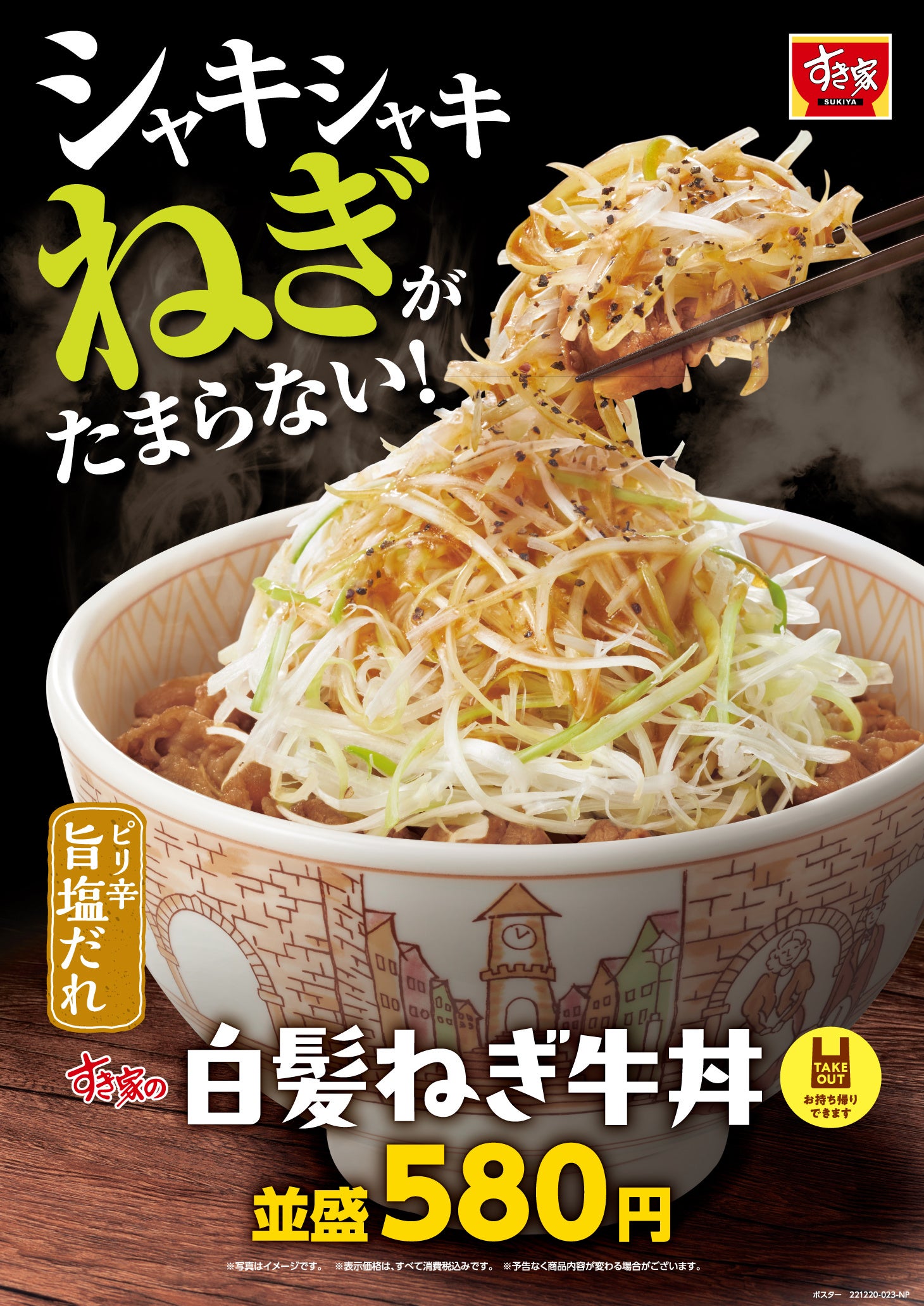 株式会社すき家(代表取締役社長:笹川 直樹 本社:東京都港区)が展開する牛丼チェーン店「すき家」では、12月21日(水)AM9:00より、「白髪ねぎ牛丼」「にんにく白髪ねぎ牛丼」を全国の店舗で販売します。