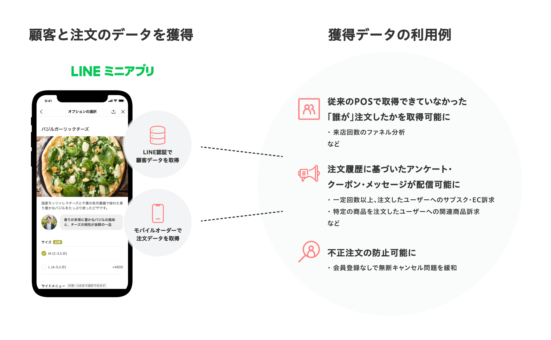 LINEミニアプリでは、アプリダウンロード・会員登録なしで、お客さまのLINEアカウントに紐づいた注文データが取得できます。これにより、従来のPOSレジでは実現できていなかった「誰が」注文したかを分析したり、それらのデータに基づいたLINE公式アカウントでの販促が可能になります。
