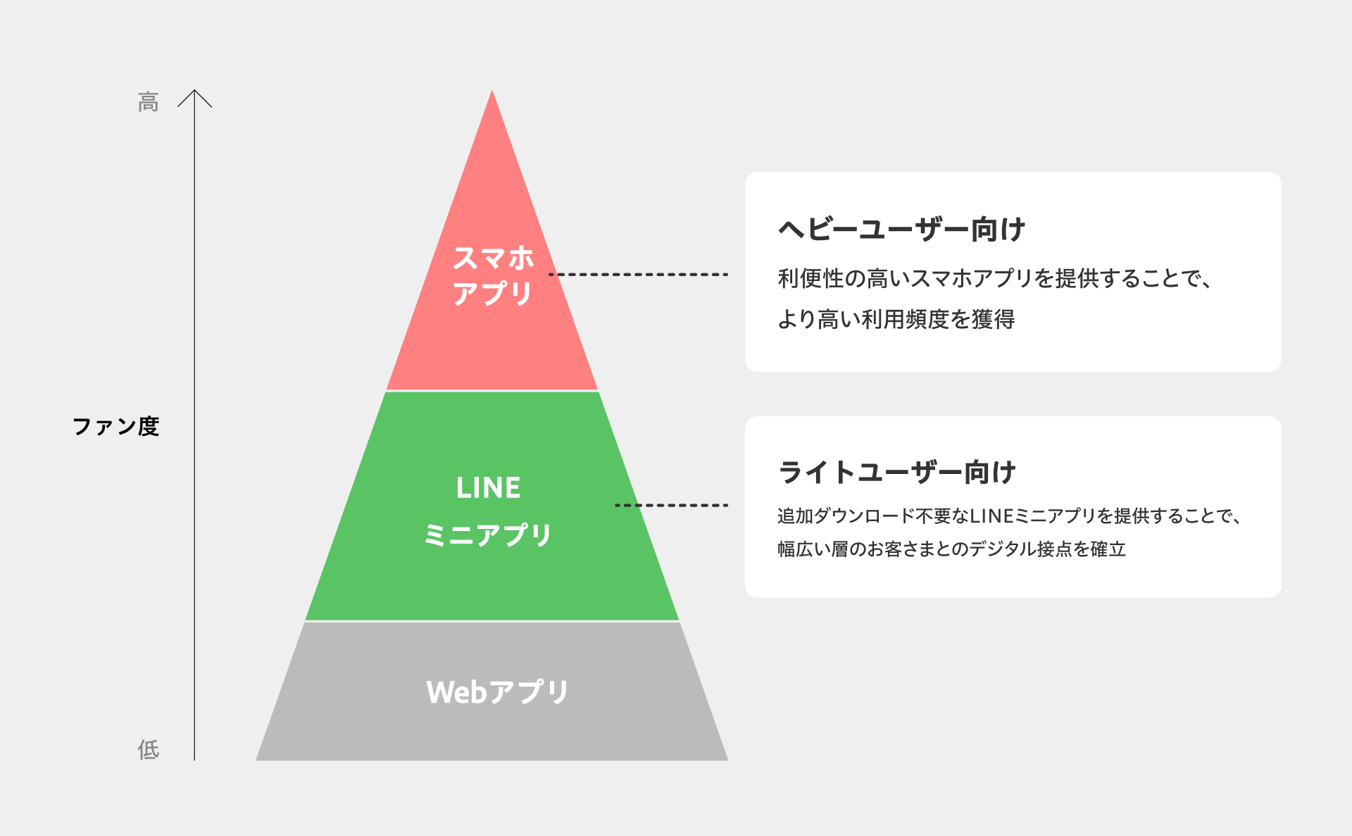 Chompyでは、LINEミニアプリをスマホアプリと組み合わせることで、ライトユーザーはLINEミニアプリ、ヘビーユーザーはスマホアプリのように、お客さまの利用度に合わせたUIを提供できます。これにより、飲食店が、より幅広い層のお客さまと、お客さまごとに適切な形で、ダイレクトにつながることをサポートします。
