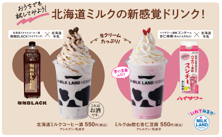さらに、北海道牛乳の飲み方提案として新感覚のミルクドリンク『北海道ミルクコーヒー酒(550円税込)』と『ミルクde飲む杏仁豆腐(550円税込)』を発売します。