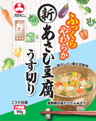 旭松食品株式会社(本社:大阪市、本店:飯田市 社長:木下博隆)は、SOYLEICTM (Missouri Soybean Merchandising Council )、Brushvale Soy Products社、朋和商事株式会社とともに、高野豆腐用の高オレイン酸大豆を共同開発しました。この大豆を使用した「新あさひ豆腐うす切り99g」を2023年2月1日より全国で発売致します(オープン価格)。