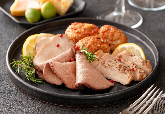 - [1]芳寿豚ローストポーク [2]国産合挽きミンチのミートボール [3]彩りピクルス [4]但馬玄ローストビーフ [5]スモークサーモンローズ [6]ホタテとサーモン市松パイ包み [7]牛肉八幡巻 [8]ショコラパウンド