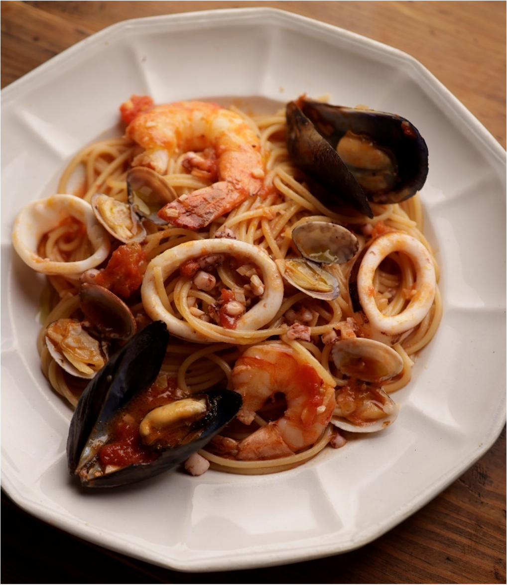 パスタはシーフードたっぷりで見た目も贅沢な「ペスカトーレ」(漁師という意味)。イタリアの海辺の町では旬の魚介を使います。貝類から出るおいしいだしがたまらない!