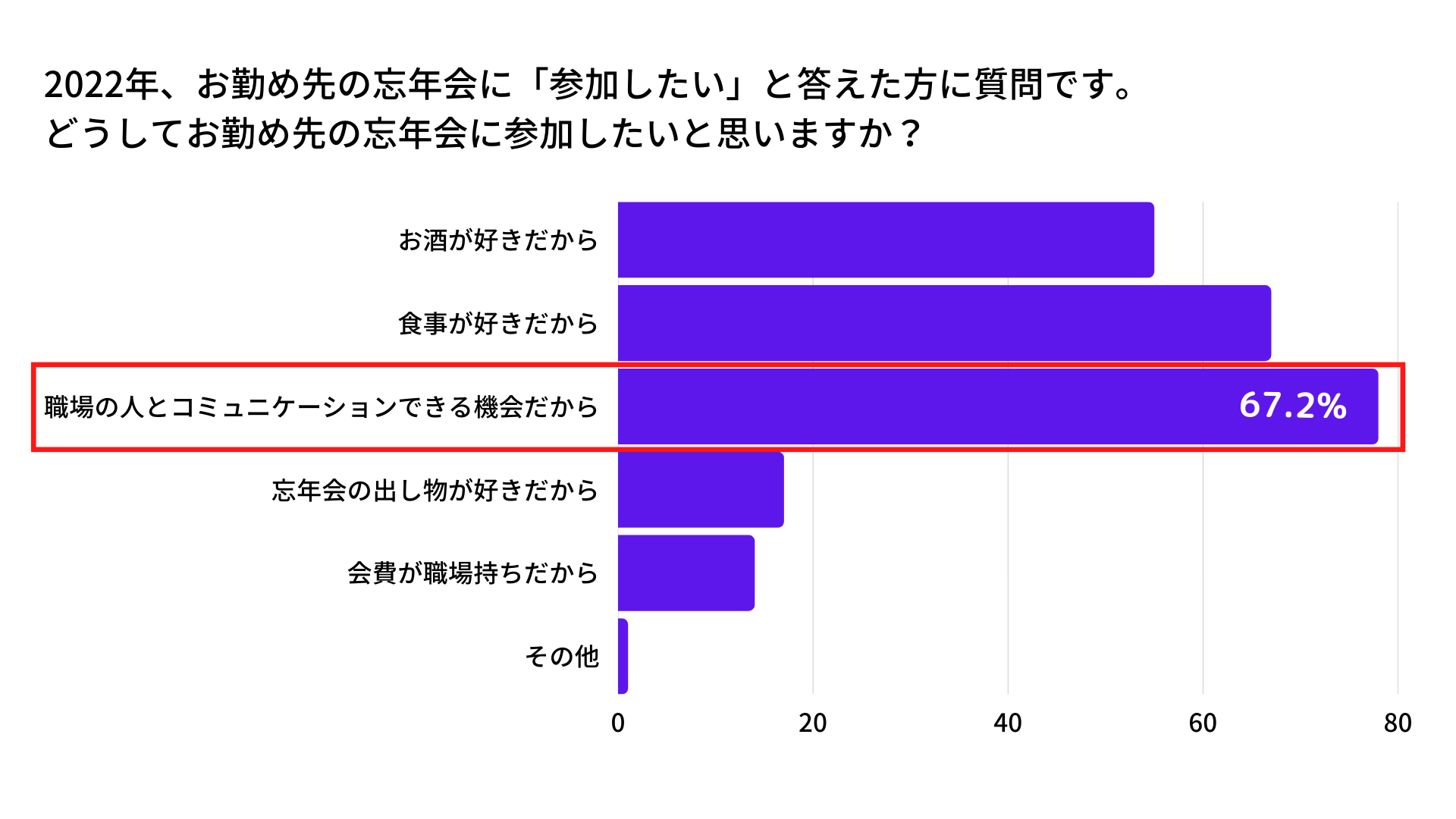 「職場の人とコミュニケーションできる機会だから」が67.2%と最多数でした。