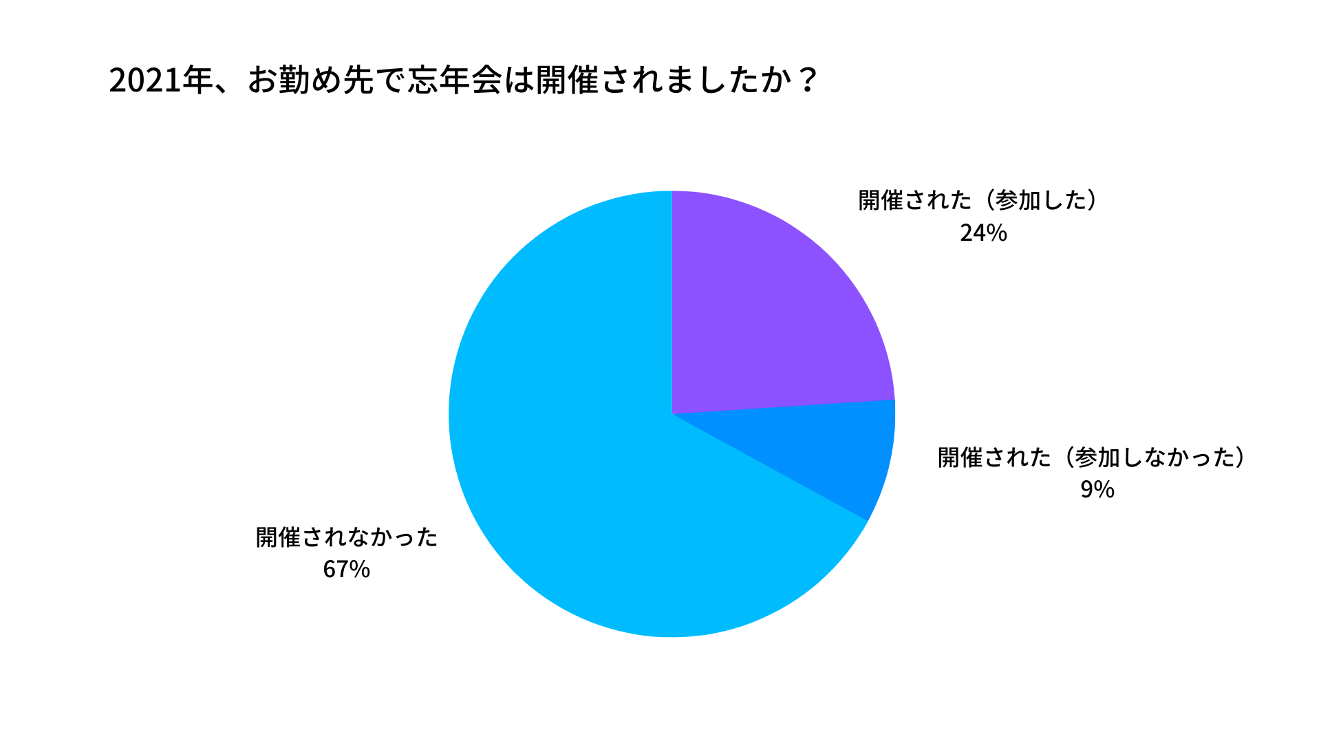 2021年に職場の忘年会が開催されたか尋ねたところ、「開催されなかった」と答えた人が67%と最多となりました。去年はまだコロナ禍の影響を強く受けていたことがわかります。