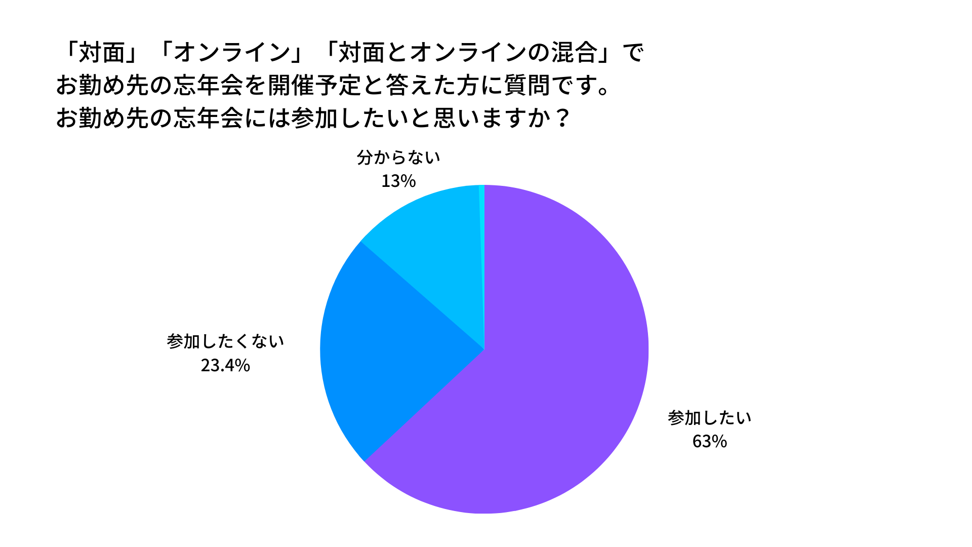忘年会が開催される予定と答えた人に、忘年会に参加したいと思うか尋ねたところ、63%が「参加したい」と答えました。一方、「参加したくない」と答えたのは23.4%でした。