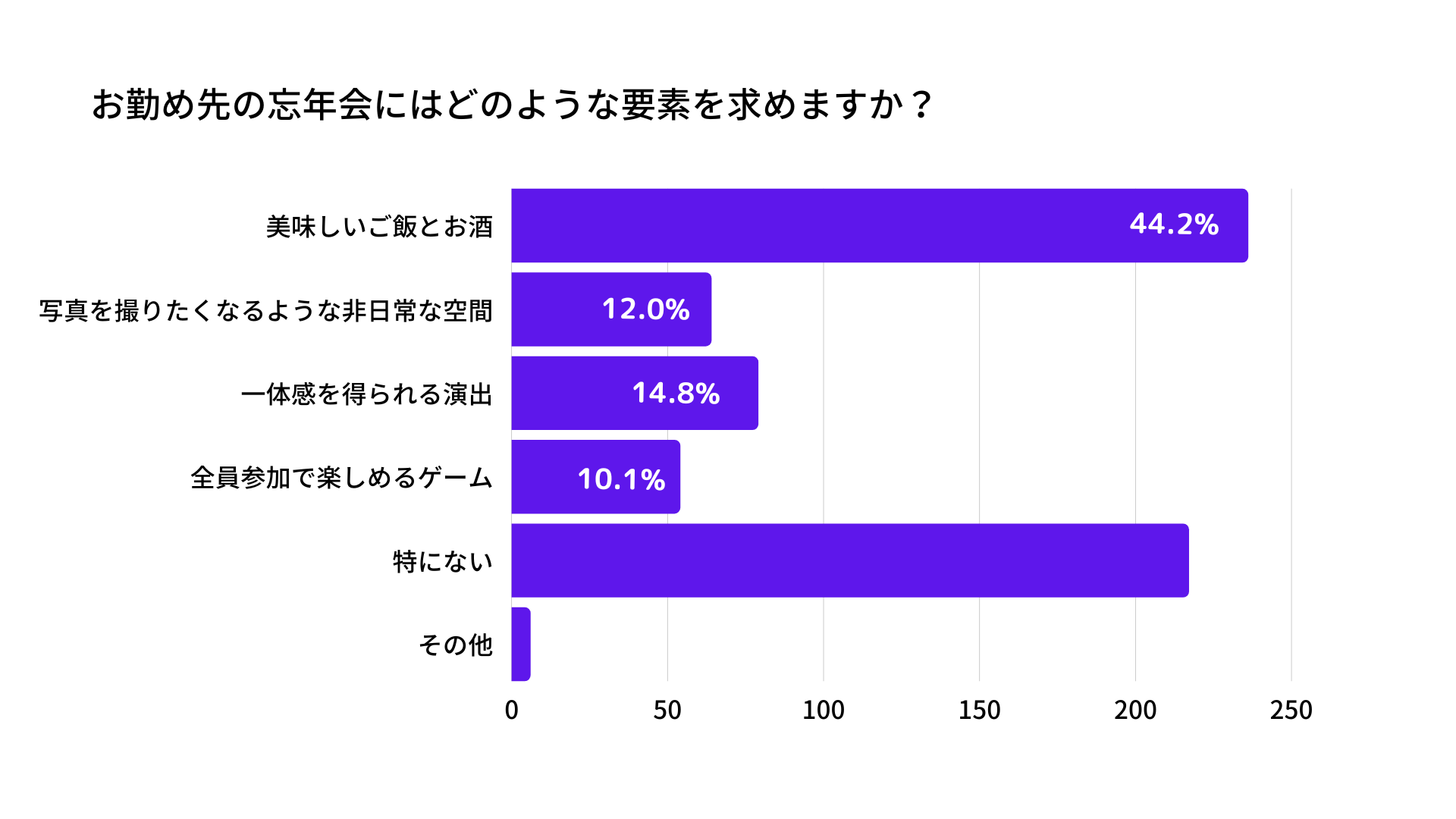 職場の忘年会にどのような要素を求めるか尋ねると、「美味しいご飯とお酒」が44.2%と大多数を占めました。他は「一体感を得られる演出」が14.8%、「写真を撮りたくなるような非日常な空間」が12.0%、「全員参加で楽しめるゲーム」が10.1%と、食事のメニュー選びが忘年会の成功を左右しそうな結果になりました。