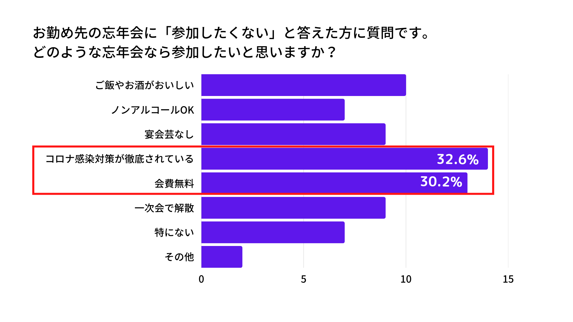 - 忘年会に参加したくない人が参加したいと思うようになる条件1位2位は「コロナ感染対策が徹底されている」と「会費無料」
