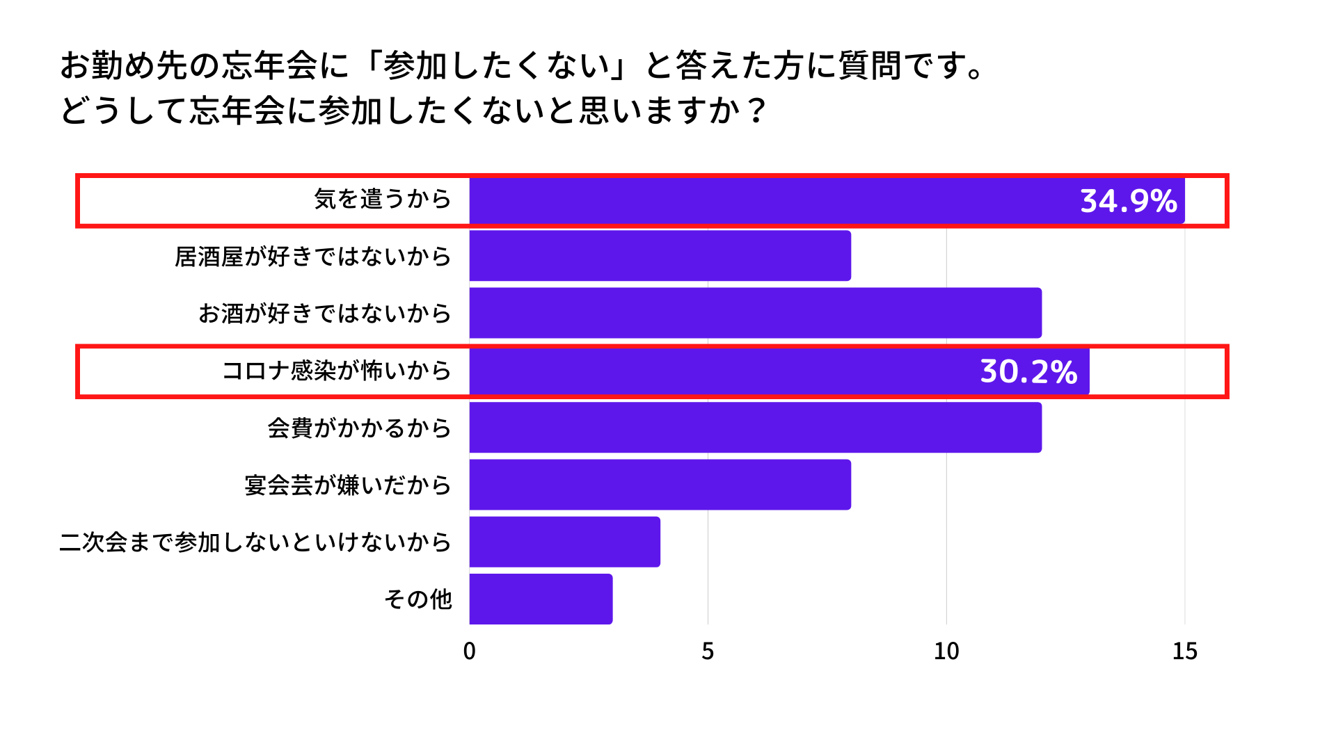 - 忘年会に参加したくない人の理由1位2位は「気を使うから」「コロナ感染が怖いから」